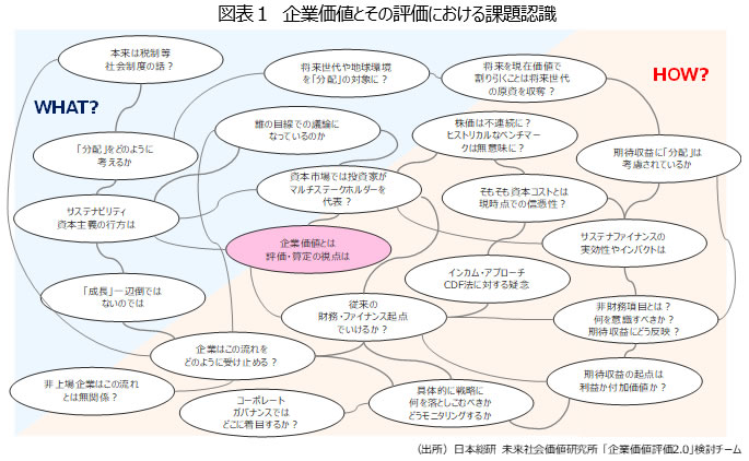 これらの課題認識を整理し、企業価値評価の在り方を具体的に検討することとしたが、検討メンバーの有する課題は、「そもそも企業価値とは何か(=WHAT?)」に関するものと、「企業価値を具体的にどのように評価するのか(=HOW?)」に関するものに大別することができた。その上で、基本的な3つの論点を導き出し、その論点の中から、検討メンバーがそれぞれの関心事項を深堀するという形で論考を進めてきた 。