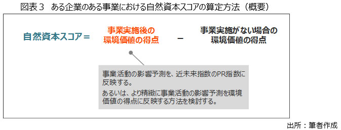 この考え方を援用して、企業活動に基づく各指標の変化を加味できれば、スコア化ができる余地はある。企業がある事業において、ある自然資本を利用あるいは増強・拡張させようとするとき、関係する自然資本家が、事業内容を分析・評価し、事業前後の環境価値の得点の差分を算定し、事業の価値をスコア化するのである(事業の価値をどのように企業価値に統合するかは、後段で述べる)。なお、本稿では、仮にこれを自然資本スコアと呼ぶ。同様の考え方で、人的資本スコアや社会・関係資本スコアを考える。ただし、インパクト投資の分野でも言及される追加性の課題、すなわち、その社会への影響は、企業活動のために引き起こされたのかを客観的に判断できるかという点は、継続的な検討課題である。また、各資本の状態の把握や資本スコアの算定等を誰の費用で実施するのかというのも検討課題である。一義的には、企業の事業継続のための価値評価であること、また、足元でも、TNFD等の環境・社会への影響評価は企業がコスト負担して実施していることから、企業が負担すべきであると考えるが、精緻化には、継続的な検討が必要である。