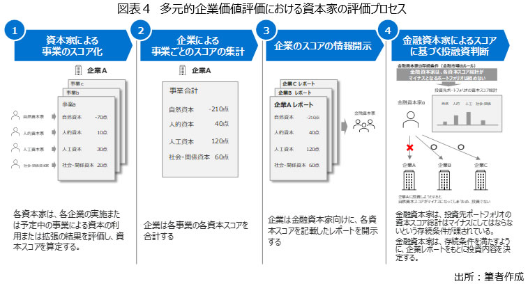 対して、多元的企業価値評価では、企業と接点を持つ各資本のステークホルダーである市民が、各資本の代理人となる。何らかの方法で選出された市民が、資本の内容ごとに設定される閾値に対して、評価対象の企業による利用および影響がどの程度のインパクトがあるのかをスコア化して評価する。ただし、資本間でトレードオフがあるため、単一企業がすべての資本領域でスコアを改善することは困難であり、かつ、資本家同士も利害対立を引き起こす可能性があることから、積極的な意味で金融資本家と企業間の市場のみとし、金融資本家は、各資本スコア総計がマイナスとなるポートフォリオは組めないというルールを設ける方法を仮説として提示した。金融資本家を介して他資本の観点で企業を評価するという点では、従来と変化はないが、金融資本家は、金融資本と同様に、金融資本以外の他資本の状態を維持・向上させるというルール(義務)があること、かつ、他資本の観点で一次評価するのは、市民が代理人を担う各資本家であることが異なる。多元的企業価値評価により、企業は、一元的な金融資本の永続的な増加という呪縛から解かれ、企業自身が目指す資本の向上に取り組みやすくなり、総合的に見て、各資本の状態が向上することが期待できる。