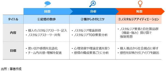 ノスタルジアデザインによる情緒価値探索ワークショップは、「回想→分析→発想」の三段階で構成されます。