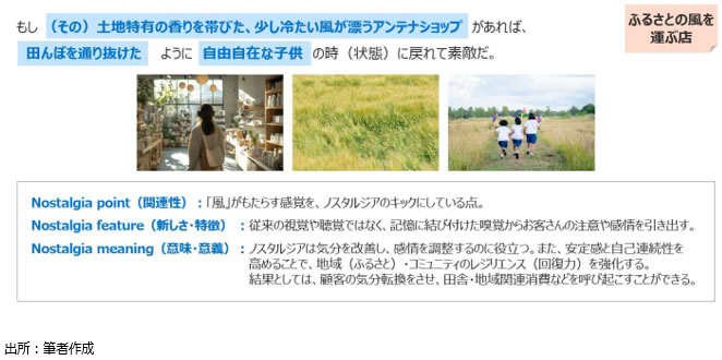 ノスタルジアのトリガーとして「風」を着想のきっかけにしました。風は一瞬で消えてしまうはかなさや、かすかな匂いとともに人の記憶を呼び覚ます要素があり、その感覚が強い情緒的な印象を残します。この発想から、特定の店舗にその土地特有の「風(空気)」をつくり出し、流し続けることで、訪れる人のノスタルジアを喚起する仕組みを構想しました。結果として、その土地ならではの香りや空気感を届けるアンテナショップの形となり、ふるさと納税や地域消費の促進にもつながるアイデアへと発展しました。