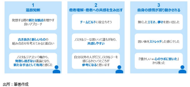 こうしたフィードバックから、ノスタルジアデザインワークショップ は以下のようにさまざまな領域での活用が期待できることが示されました。