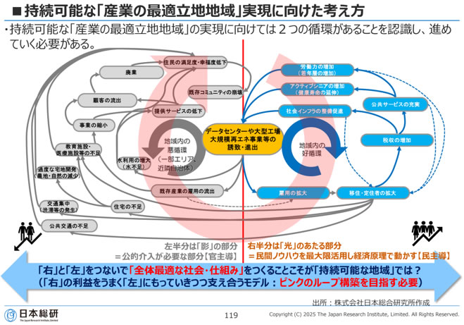 一方で、「経済を中心とした好循環」が実現されるがゆえに、その裏側では急激な人口増加による交通渋滞の発生、公共施設の不足、コミュニティーの崩壊、さらには地域医療・介護といった命に関わる仕事に従事する人材の流出といった「既存の社会システムの急激な変化による負の循環」が起こりうる点については十分留意する必要がある。これは地域のために産業を作る、誘致することが、一歩間違うと中長期的な地域の持続可能性を奪うという点に他ならない。