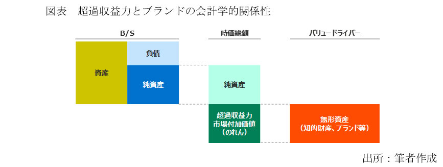 会計学の専門家である櫻井通晴氏や平屋伸洋氏は、コーポレート・レピュテーションを財務諸表に載らない無形資産と捉え、超過収益力を生み出すバリュードライバーと位置付けている(※2)。一方で政府が主導する「企業と投資家の対話のための『価値協創ガイダンス2.0』」では、企業や商品・サービスの信頼という「ブランド」を、知的財産等と同様の無形資産と見なし、ブランドの強化が企業価値創造に重要であると説明している(※3)。本稿では後者の主張に従い、ブランドという無形資産が超過収益力を生み出すものと整理する。