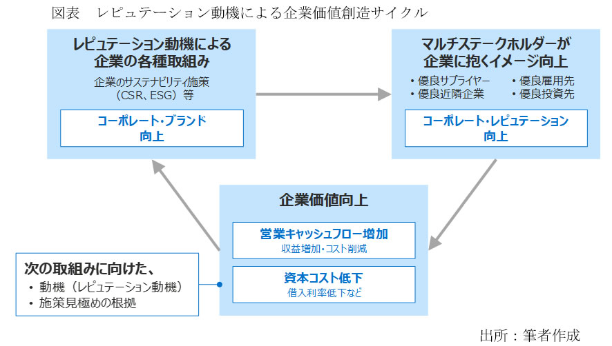 その上で、企業のサステナビリティ推進といった、レピュテーションの向上を動機とした取り組みが、企業価値向上につながるプロセスを、下の図表に示す。企業がサステナビリティ施策を実施することで、コーポレート・ブランドという無形資産が蓄積される。するとマルチステークホルダーがさまざまな観点で「優良企業」と認識することで、コーポレート・レピュテーションが向上する。結果として売り上げが増えたり資金調達が容易になったりと、営業キャッシュフローの増加や資本コストの低下という形で、企業価値を押し上げることになる。なお、企業価値の向上は企業の次なるCSR活動やサステナビリティ施策等の「善行」の動機として返ってくることになるだけでなく、次はどのような施策が有効かを見極める根拠にもなる。このように、レピュテーション向上を動機とした価値創造は、フローではなくサイクルを形成するものと解せる。