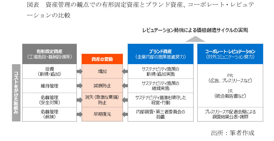 コーポレート・ブランドという無形資産の場合も、基本的には同じである。CSR活動やサステナビリティ施策を実施することで、ブランド資産が増加する。資産なので何もしなければ減衰していってしまうが、施策を継続することで減衰を抑制できる。急激な棄損防止の観点からもやはり施策の継続が重要だが、危機管理の視点では施策を打ち出すというよりも、コンプライアンス等の法的拘束力のあるルール(ハードロー)や、コーポレートガバナンス・コードといった明文化されたルールの順守が有効である。そしてこれらは組織としての企業活動のみならず、経営者や従業員一人ひとりの行動も大きく影響してくる。しかしこれらの危機管理対策を行ってもなお生じてしまう不祥事等のレピュテーションリスクに対しては、内部調査や第三者委員会の設置等を速やかに行うことで、棄損したブランド資産の早期回復を図るのだ。