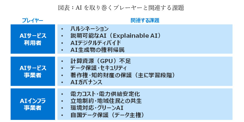 AIに関連するプレーヤーは、AIサービスを利用する「AIサービス利用者」と、AIを搭載したソフトウェア・アプリケーションなどのサービスを利用者に提供する「AIサービス事業者」、AIサービス事業者に対してGPU/サーバーなどのサービス開発・運用に必要なインフラを提供する「AIインフラ事業者」に大別される。