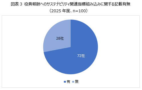 役員報酬へのサステナビリティ関連指標組み込み状況の調査結果を図表3に示す。2025年度の有価証券報告書で役員報酬への指標の組み込みについて記載した企業は100社中72社であった。役員報酬へのサステナビリティ関連指標の組み込みについても、国内外の基準・ガイドラインやESG評価機関の要請が企業に影響を与えている可能性がある。具体的には、CDPやMSCI等のESG評価機関は役員報酬にサステナビリティ指標を組み込むことで企業のガバナンスが強化されると評価しており、ESG評価機関の要請等が要因となって、役員報酬への組み込みが進展している可能性がある。