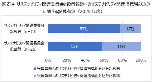 また、前述のサステナビリティ関連委員会に関する記載有無に沿って役員報酬へのサステナビリティ関連指標の組み込みの記載有無を分類した結果を図表4に示す。委員会について記載のある企業は、記載のない企業と比較してより多くの割合で、役員報酬への関連指標組み込みについて記載していた。サステナビリティに関する議論を委員会等に委任する場合、一部役員は直接的には関与しないことが想定されるが、報酬をサステナビリティへの取り組みと連動させることにより、役員のコミットメントの担保にもつなげていると考えられる。