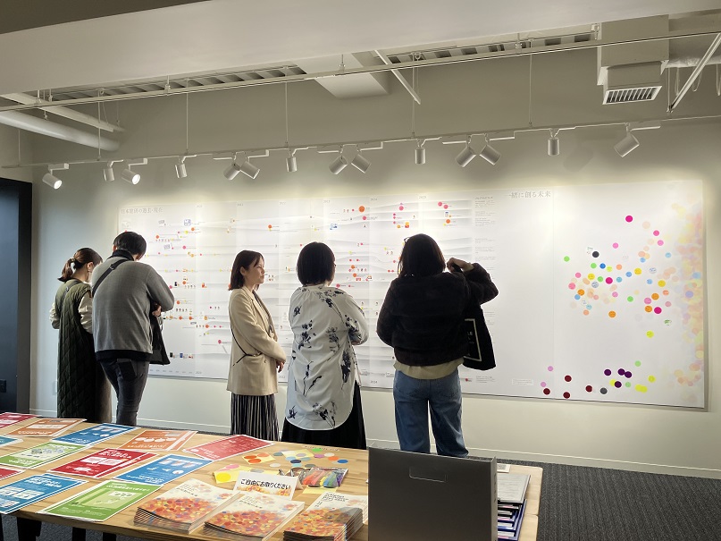 なかでも、プロジェクトの歩みに関する年表の展示は、各プロジェクトで苦戦した時期や飛躍のタイミングを波線や色で表現しており、「誠実さが伝わる、心に残る展示だった」との感想が寄せられた。2時間以上かけてじっくりと展示を見ながら対話を重ねる方も多く見られ、来場者とのコミュニケーションを図ることができた。展示を通して私たち自身も新たな発見と多くの手応えを得ることができ、デザインの力を改めて実感する場となった。