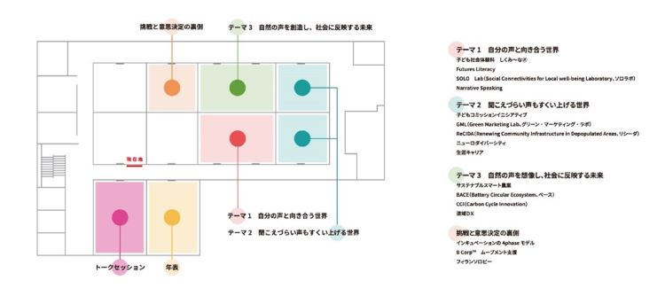 これらを通じて、創発戦略センターがこれまで取り組んできた活動の全体像を紹介している。また、年表を制作し、展示する専用の部屋を設けた。さらに、ワークショップやトーク企画を通じて、日本総研の活動をより多くの来場者に伝える構成とした。