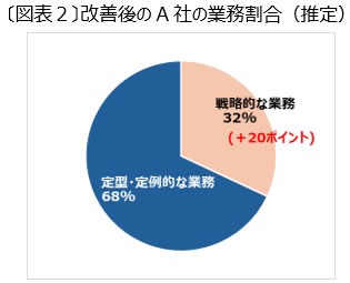 冒頭に紹介したA社では現状分析による業務非効率の要因を特定した結果、「不要業務の廃止」や「既存人事システムの見直しや機能拡充」等を主な効率化施策として推進することを決定し、2年後には現行比+20ポイント程度の戦略的業務の拡充余力を創出する見通しである。(図表2)