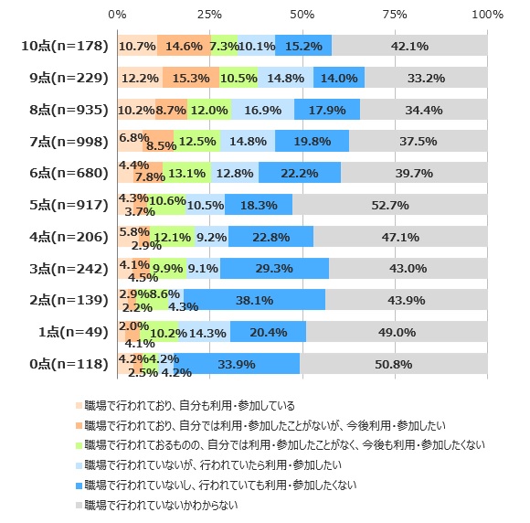 次に興味深いと感じたのは、生活満足度が高い親ほど子どもと勤務先や仕事内容について共有が出来ている点です。子どもが「仕事内容も勤務先の名前も知っている」と回答した人の割合は、生活満足度10点では66.9%、生活満足度0点では34.7%となり、その差は約32ポイントとなりました。また、回答者の参加状況や意欲に関わらず、職場見学など、自社施設で実施される子どもや家族向けイベントが行われていると回答した人の割合は、生活満足度の高い回答者でより高まる傾向が見られました。従業員の家族と企業の接点としてこのような取り組みを行うことは、従業員のウェルビーイングを支えることへ寄与する可能性が示されました。