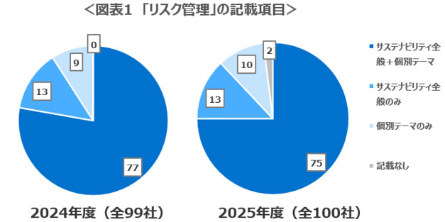 開示形式の内訳を図表1に示す。開示形式の内訳は、サステナビリティ全般のリスク管理について記載した企業が微減する等の変化はあったものの、昨年度と傾向としては大きく変化していなかった。サステナビリティ+個別テーマを開示した企業数は75社存在した。これらの企業では、まずサステナビリティ全般に関し「ガバナンス」や「戦略」等と並べて「リスク管理」のセクションを設け、次に個別テーマごとに章立てしてリスク管理の記載を行う例や、個別テーマごと「リスク管理」のサブセクションを設ける例が見られた。また、個別テーマのリスク管理については見出しのみを設け、詳細な説明は「サステナビリティに関する考え方及び取組」の後段の「事業等のリスク」を参照する事例も見られた。「サステナビリティ全般」のみを開示している企業は13社存在し、昨年度と同数であった。このような記載をしている企業の中には、サステナビリティに関連したリスクを、全社的なリスク管理プロセスに統合している旨を記載する企業も見られた。