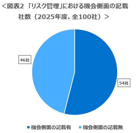 続いて、「リスク管理」においてサステナビリティに関する機会の管理について記載した企業は54社確認された。今般プライム企業において対応を迫られているSSBJ基準では、「リスク管理」に関連してリスク側面のみでなく機会側面の管理についての記載も要請されている(一般開示基準29項)(※2)。他方、2017年に公表された気候変動に関する主要な開示基準であるTCFD提言では、リスク管理の項目においてはリスクに関する開示のみが要請されており、機会については含まれていなかった(※3)。SSBJ基準は、時価総額3兆円以上の企業に対して27年度3月期から、時価総額1兆円以上の企業に対しては28年度3月期から適用が義務化される。本調査の対象であるTOPIX100の企業はいずれも時価総額1兆円を超えている(※4)が、SSBJ基準の適用義務化が迫るこれらの企業の多くにおいても、機会側面の開示が進んでいないことが分かった。