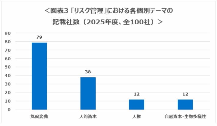 また、個別テーマのリスク管理については、気候変動が最も多く79社が記載していた。その後に人的資本の38社が続き、人権と自然資本・生物多様性についてはいずれも12社が記載していた。TCFD/TNFDのガバナンス、戦略、リスク管理、指標及び目標という4つの柱のうち、リスク管理のみ全般に統合し、残りの3つを個別テーマの項で開示する例も見られた。図に示したテーマ以外には、情報セキュリティ(4社が記載)や大規模災害への対応(2社が記載)が見られた。