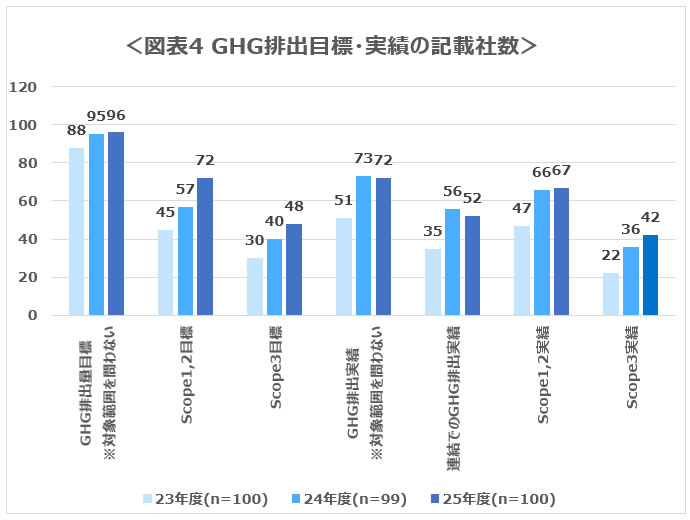 上記を踏まえ、Scope 1、2、3排出量の目標・実績の開示状況を整理した。GHG排出量目標の整理結果を図表4に示す。GHG排出量目標(総量目標、原単位目標を含む)については、100社中96社において開示されていた。Scope 3の目標を開示する企業は48社であり、2023年度から3年連続で増加した。
