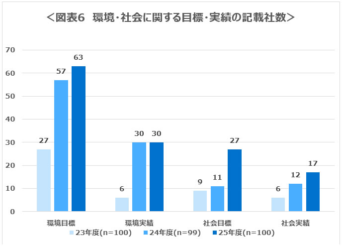 結果を図表6に示す。環境関連の目標を開示している企業数は63社、環境関連の実績を開示している企業数は30社であり、2024年度と同程度の水準であった。他方、社会関連の目標を開示した企業数は27社、社会関連の実績を開示した企業数は17社であり、2023年度から2年連続で開示企業数が増加していた。環境関連の目標としては、再生可能エネルギーの利用率や水使用量が見られた。社会関連の目標としては、人権デュー・ディリジェンスの実施拠点数やコンプライアンス関連の重大事案数等が見られた。食品業界の企業であれば健康増進にかかる指標、保険業界であればWell-beingに資する商品の契約件数など、自社の業種と関連した指標を設定するケースも見られた。開示の形式としては、目標・実績とマテリアリティの対応関係を表形式で整理する例が散見された。