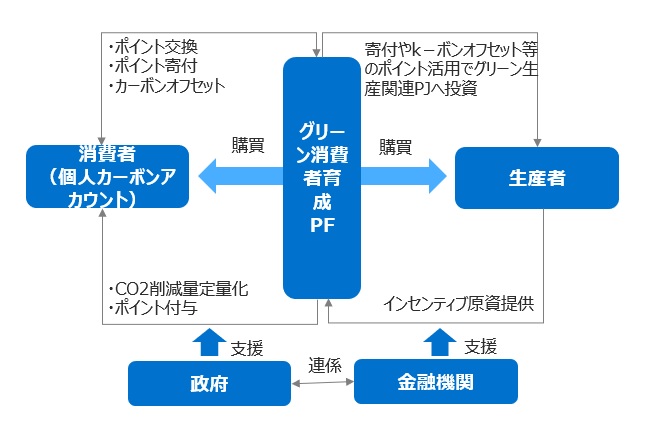 この仕組みを効果的に機能させるためには、消費者ごとのCO2排出量を記録する個人カーボンアカウントと、これを運営するプラットフォームの構築が必要となる。個人カーボンアカウントは、消費者の決済データに基づいて各消費におけるCO₂排出量を定量的に算定し、CO₂削減量を登録、蓄積、交換、さらには取引することが可能な性格を有する。プラットフォームは、個人ごとの削減量を一括して蓄積・管理するとともに、取引を通じてCO₂削減量の価値化を行い、消費者へインセンティブとして還元する機能を果たす。加えて、環境価値の理解促進や、供給側と消費者の意思疎通促進、データ利活用を通じた政策や金融政策の策定への貢献などの役割も期待される。
