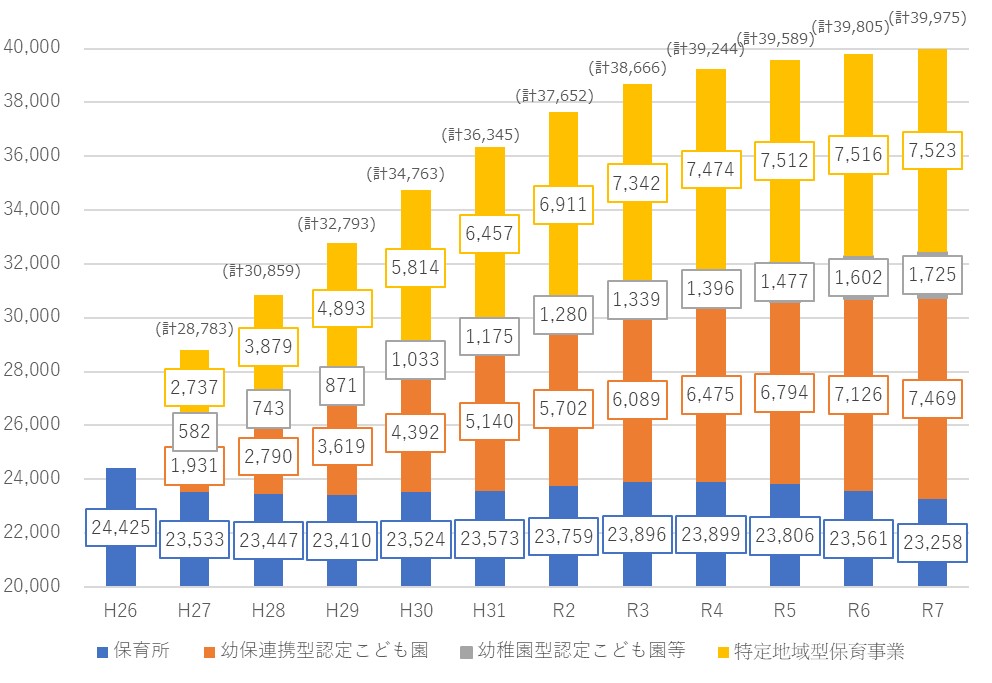 この背景には、政府が待機児童対策を最重要政策に掲げ、保育の受け皿整備を急速に推し進めてきた経緯がある。2006年開始の「認定こども園制度」に加え、2015年には「子ども・子育て支援新制度」に基づき、小規模保育等の「特定地域型保育事業」が開始された。さらに2016年には、内閣府主導で「企業主導型保育事業」が導入された。これらの施策の結果、企業主導型を除く保育所等の数は2016年4月の約3万か所から、2025年4月には約3万9千か所へと拡大し、定員数も約260万人から約300万人規模へと増加した(※3)。