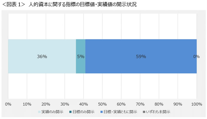 本調査の対象となる有価証券報告書上では全779個の人的資本に関する指標が開示されており、各指標で目標値・実績値が開示されているかを調査した。(図表1)その結果、目標値・実績値ともに開示されている指標が59%であり、実績値のみを開示するのではなく、目標値も設定して開示する動きが広がっていることが分かる。