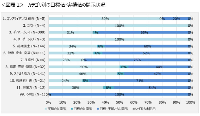 カテゴリ別に目標値・実績値ともに開示されている指標の割合を見ていくと(図表2)、相対的にN数が多いダイバーシティ(N=300)で65%、組織風土(N=144)で60%、スキルと能力(N=141)で47%、健康・安全・幸福(N=111)で62%となっており、多くの企業が開示するカテゴリの指標においても目標値・実績値の開示が進んでいる。目標値・実績値ともに開示されている各カテゴリの指標の具体例としては、ダイバーシティでは女性管理職比率・女性役員比率・男性育児休業取得率、組織風土ではエンゲージメントスコア・働きがい指数、スキルと能力ではDX人材・デジタル人材などの専門人材数・研修費用/時間、健康・安全・幸福では労災発生件数・検診受講率・有休取得率などが挙げられる。