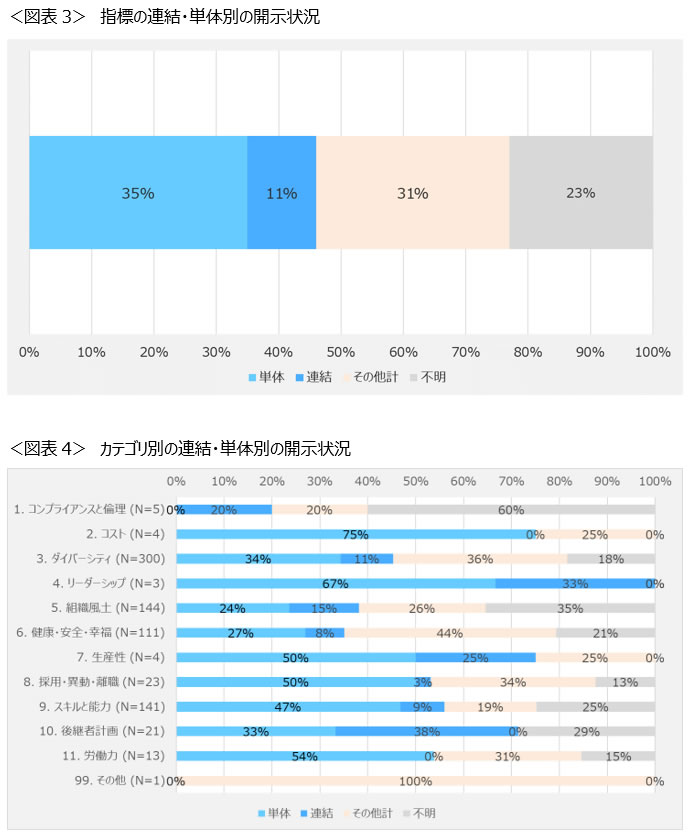 また、前述の改正内閣府令においては、人的資本に関する指標および目標について、提出会社およびその連結子会社から成る連結会社を対象に記載することが求められている。この点、金融庁留意事項においては、連結ベースの指標が設定されていないことを指摘している。そのため、調査対象企業が人的資本に関する指標を開示する際の開示対象範囲の状況についても調査した。