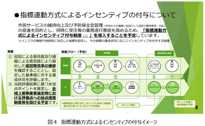 東京都府中市では、市内に位置するけやき並木通り周辺地区の一部の道路施設・業務を対象とした群マネ事業が2014年度に開始され、現在では、市全域を3地区に区分した3つの事業から構成される市内全域を対象とした事業へと発展を遂げている。特に、同市では性能規定をいち早く導入しており、本稿執筆時点では最新の事業となる「道路等包括管理事業(全域2期)」では、性能規定だけでなく指標連動方式の導入が予定されており(※7)、先進的な取組となっている。具体的には、対象施設の要補修・修繕箇所等の発見率(=巡回による発見数/(巡回による発見数+要望相談受付件数))を指標として設定しており、この指標に関連する巡回の回数やルート等の設定は民間事業者の裁量に委ねられている。換言すると、指標の達成は民間事業者の努力次第となることが伺える。また、指標に対する達成状況次第では全域3期事業の事業者選定時に評価点への加点(※8)が予定される等、民間事業者の業務遂行意欲を促進する仕組みを構築している。