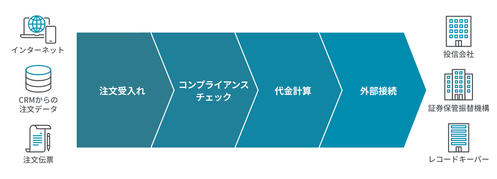 システムを組み合わせることで、投資家からの注文伝票受入れ以降の事務処理を完全自動化。人手を介することなく投信会社や証券保管振替機構への連絡、投資家への取引報告書の発送業務が可能になり、投信インターネット取引システムでの注文も、オペレータによる入力が不要になりました。