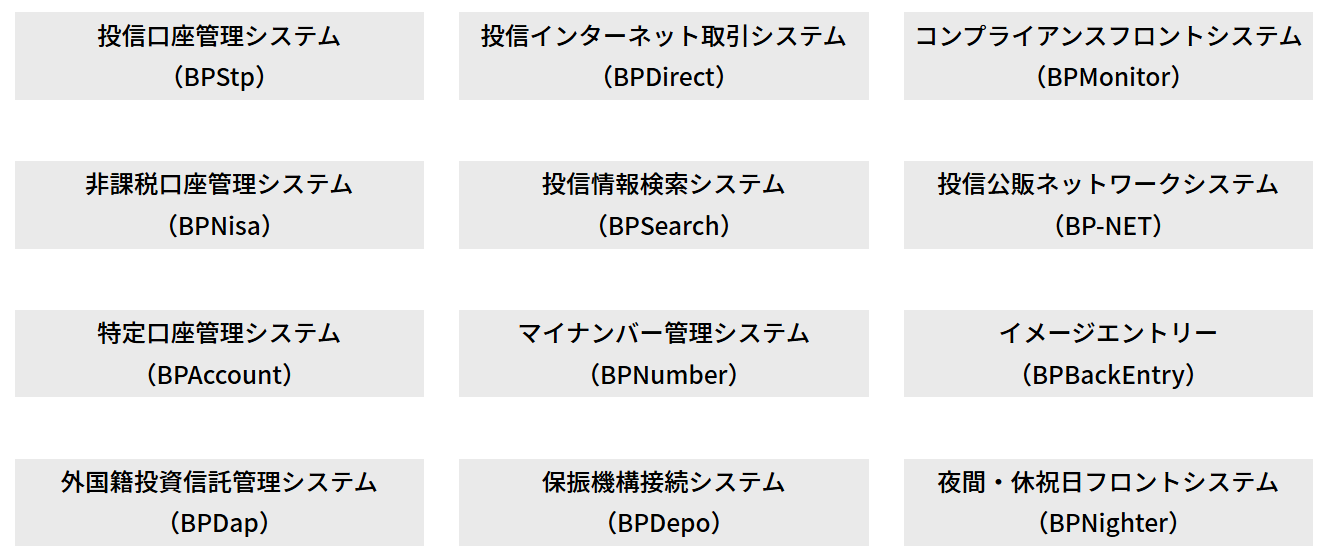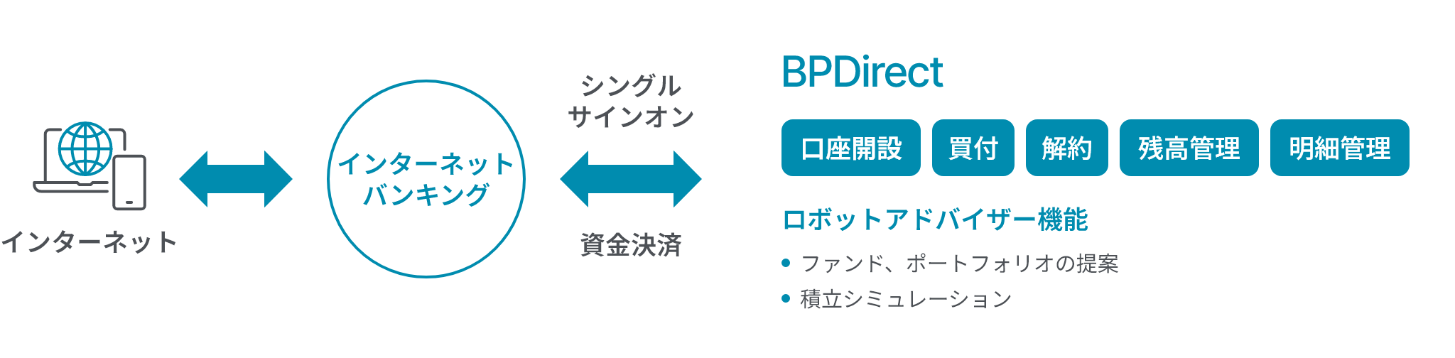 BPDirect(投信インターネット取引システム)は、今後も増加が期待される投信インターネット取引を、様々なオプション機能によりサポート。当社の豊富なシステム構築・サービス提供実績に基づいて、「多彩な営業チャネル」「効率的な事務処理」を同時に実現します。