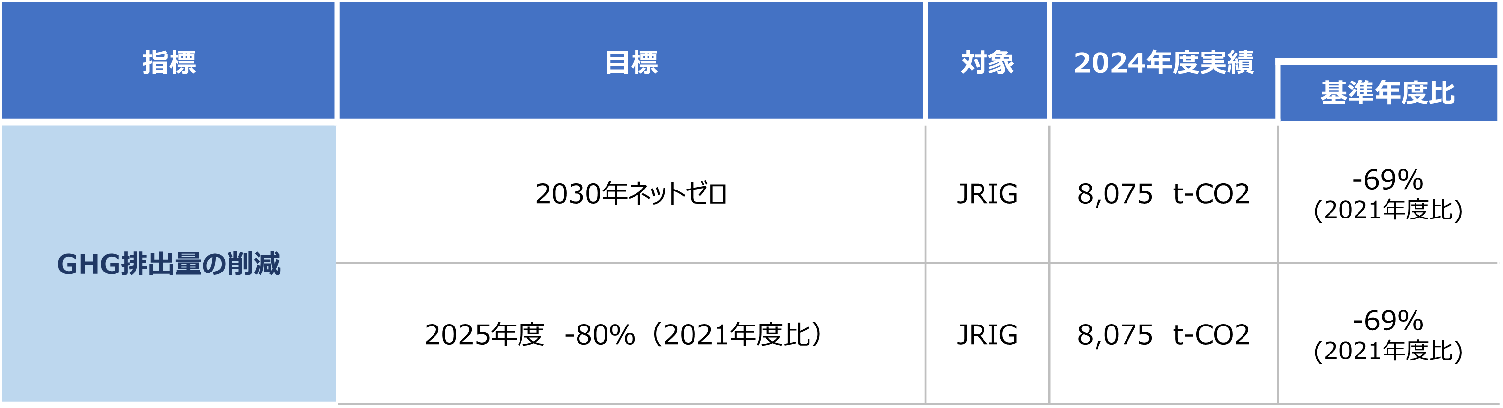 ●地球温暖化対策をはじめとする脱炭素の取り組みを推進するため、日本総合研究所およびその連結子会社の事業活動で排出するGHG排出量を2030年までにネットゼロとします。また、その中間年度である2025年度までに2021年度の実績比80%削減を目標とし、着実に施策実施・推進を行い、目標達成の見込みです。