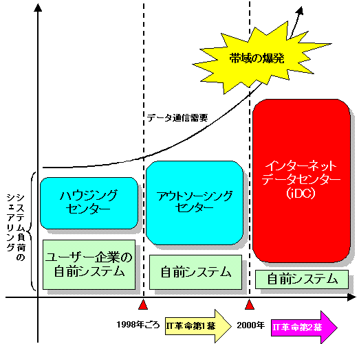 この企業情報の「包括的貸倉庫」がデータセンターであり、これを社会インフラとして整備されることになるインターネットのブロードバンド回線を使って行うものが、インタネットデータセンター(iDC)である。
