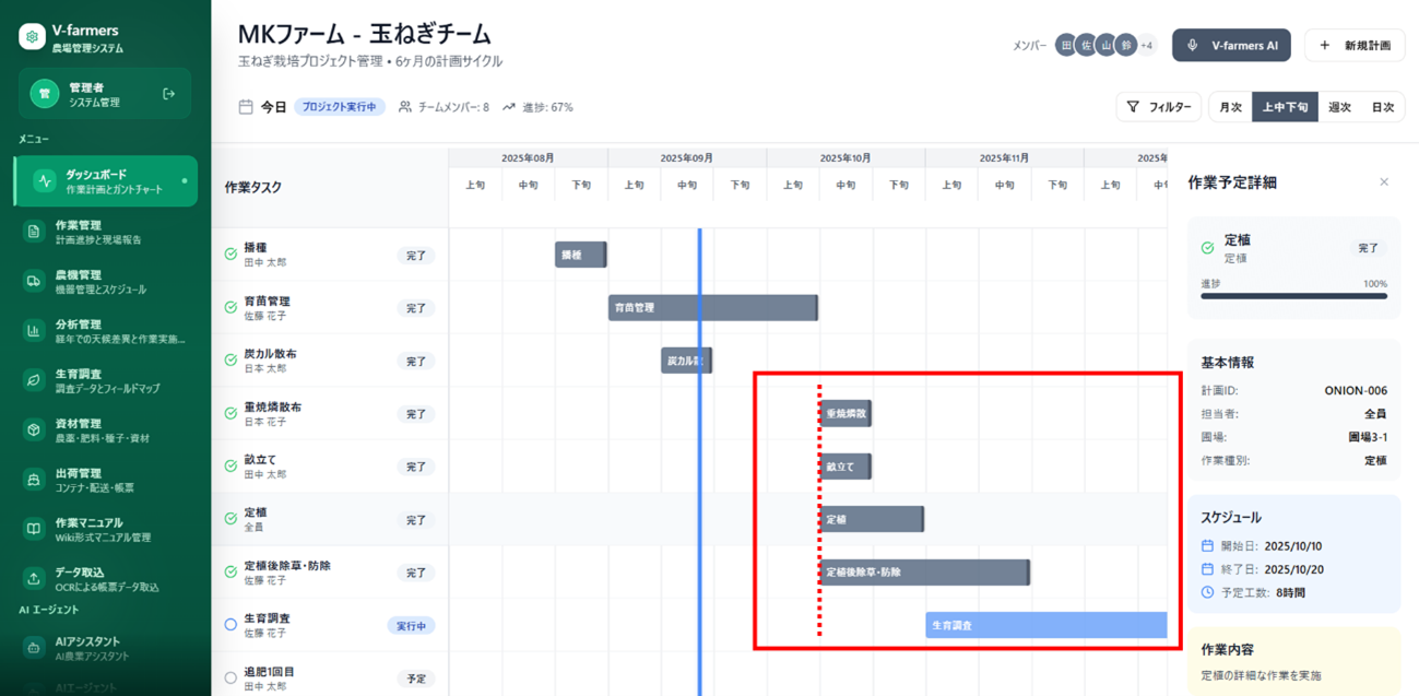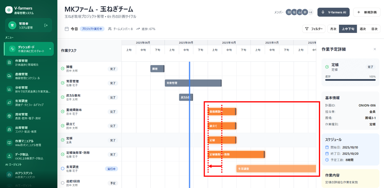 V-farmers®プロトタイプの管理者PC画面。雨予報を踏まえた作業日程の見直しをAIエージェントに指示すると、作業の前倒しを自動的に作業タスクに反映できる。