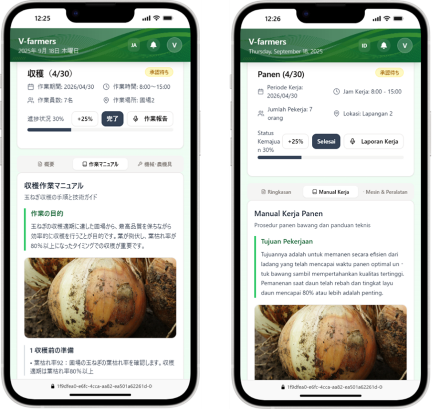 V-farmers®プロトタイプの作業者モバイル画面。左から収穫作業マニュアルの日本語版、インドネシア語版。他に英語やベトナム語など、ニーズに応じて複数言語に対応予定。