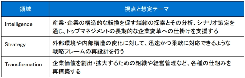 今回設立する本センターは、「Strategy」と「Transformation」という従来から存在する2つの領域に加え、「Intelligence」の領域で構成されます。Intelligenceではマクロ経済やマーケット環境のほか、地政学を含む経済安全保障にかかる状況、AIをはじめとした先進技術などの情報を収集した上で、産業・企業の構造的な転換を促す端緒の探索とその分析、シナリオ策定などを行います。そしてそれぞれの機能を融合させることで、具体的な戦略を構築して実践を図り、企業を変革に導きます。このようにして、本センターは先端的経営プラクティスの探索・開発を推進し、持続的な競争優位性を持つビジネスモデル構築の支援に取り組みます。