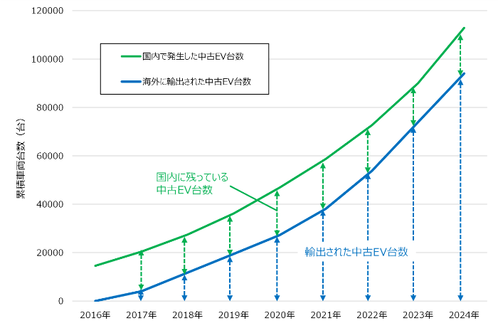(図表1)国内で発生した中古EV台数と輸出台数の累積値の推移