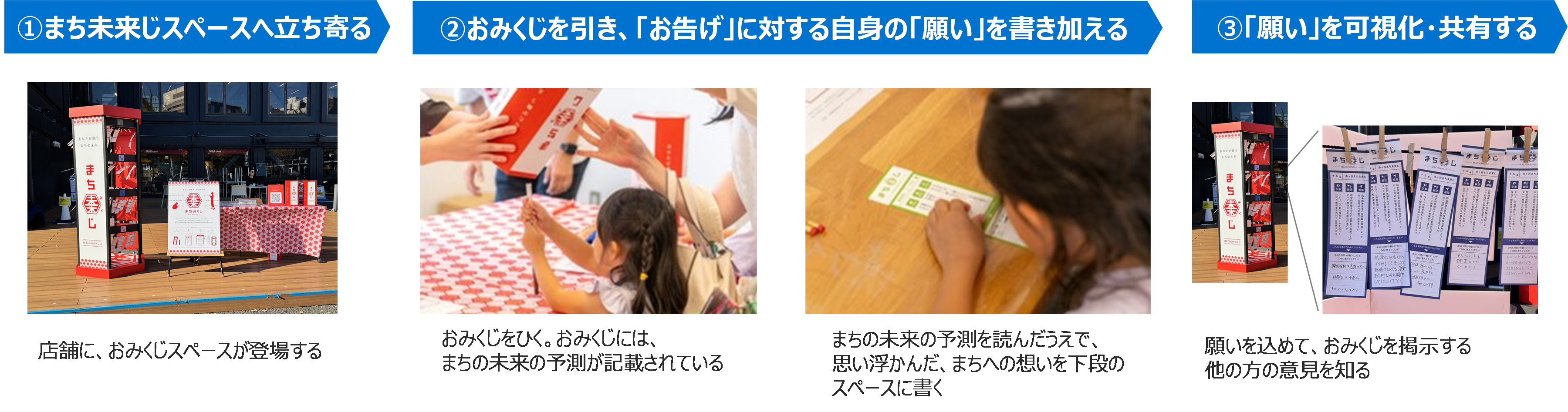 未来のまちに起こりうることをおみくじで知り、それに対する自身の考えを「願い」として書き換える体験を通じて、「まちの未来は決まっているものではなく、自分たちでつくるもの」という市民の意識醸成を促します。制度的なパブリックコメントではなく、誰もが親しみやすいおみくじを活用しながら、多様な人々が集まる民間の商業施設をフィールドとすることで市民の参加のハードルを下げ、より多くの意見やアイデアを引き出して可視化・共有することがねらいです。