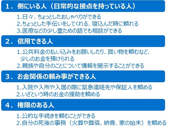 これらに該当する人を身寄りとすると、親族とは限らないし、親族が必ずしもすべてを満たさないこともわかる。また、お金や権限のことを考えると、知人・友人だけでは難しい局面があることがわかる。