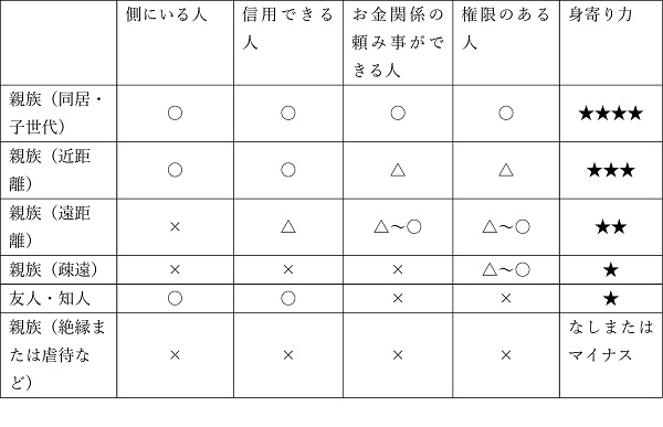 さらに、身寄りは「ある・ない」ではなく、「身寄り力」のように連続的なものとしてとらえたほうが考えやすい。下表は支援側の持つ身寄り力のイメージである。同居の子世代の親族は、4種類の支援をすべて提供可能であることから身寄り力は最も高くなっている。近距離に住む親族や遠距離に住む親族も、全てではないが部分的な支援を提供できるので中程度の身寄り力としている。疎遠な親族でも、たとえば死後事務だけは行えることがあるので身寄り力は0ではない。また、友人・知人も、部分的に支援を提供できるので、提供できる支援は異なるが疎遠な親族と同等の身寄り力を持っている。というように、関与する人がそれぞれに身寄り力を有しているととらえられる。