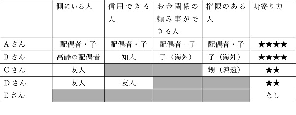 個人によって生活状況は様々であり、必要な支援もバリエーションがある。Aさんは配偶者と子によってすべての支援を受けられるので身寄り力が高い(外部のサービスを活用することも支援に含まれる)。Bさんは子は海外におり、配偶者は高齢であるが、知人にも助けを借りることができ、同様に身寄り力が高い。Cさんは普段疎遠ではあるが、甥が公的な手続きや死後の手続きを行ってくれることになっており、側には友人がいて日常的な支えになっている。ただ、お金の支払いや、保証人の依頼はできる人がいない。このような場合、金銭管理や保証人等を引き受けてくれるサービスの利用が必要となる。Dさんは友人によって日常生活上の支援は受けられるが、保証人を頼むことや公的な手続きを頼むことは難しく、死後事務を含めたサービスの利用が必要になる。Eさんは支援を提供してくれる人が誰もおらず、身寄りのない状態といえる。この場合は、CさんやDさんのようなサービスの利用に加え、地域との関りを促すような関りも同時に求められる。