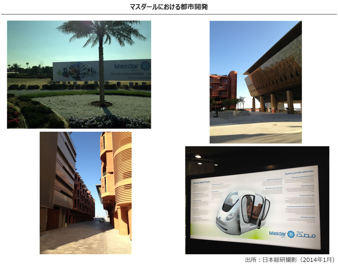 2010年頃のスマートシティ界隈で大きな夢として語られていた「マスダールシティ」は、UAEのアブダビ近郊でゼロ・エミッションを目指し、人口5万人規模の都市開発を行うという壮大な計画であった。この壮大な計画にはリーマンショックが大きく影響し、その計画の発表から10年が経った現在でも、わずか5パーセントしか完成しておらず、「ゼロ・カーボン」ではなく「ロー・カーボン」に計画変更をしたり、目玉であった個人用高速輸送システムも大量輸送機関に修正したりするなど、その都市計画は矮小化されている傾向にある(※3)。