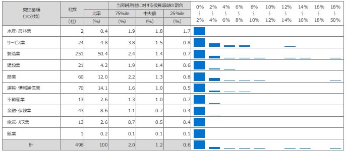 ・各社の当期純利益に対する役員報酬総額の割合(※4)は中央値で1.2%であった。