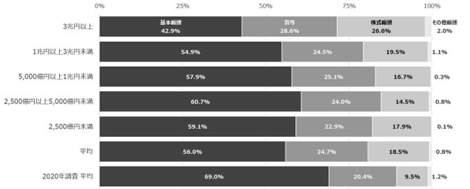 2020年調査と今回の調査を比較すると、基本報酬比率は平均で69.0%から13.0ポイント減少して56.0%となった。一方で賞与比率は20.4%から4.3ポイント増加して24.7%となり、株式報酬比率は9.5%から9.0ポイント増加して18.5%となった。業績連動報酬の比率が5年間で約1割増加したことになる。