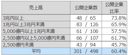 TOPIX500社において基準となる報酬構成比率を有価証券報告書上で明確に公表している企業数は301社(60.4%)であった。売上高(企業規模)が大きくなるにつれ、公表する企業の割合が高くなっている。(図表2-2)