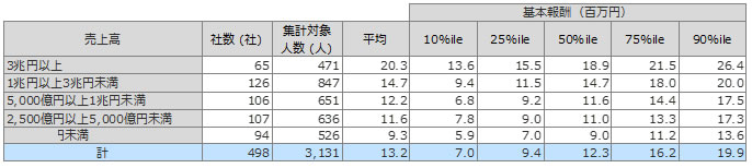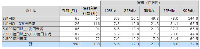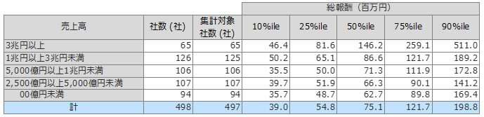 売上高区分ごとに総報酬、基本報酬、賞与、株式報酬の水準を整理した。