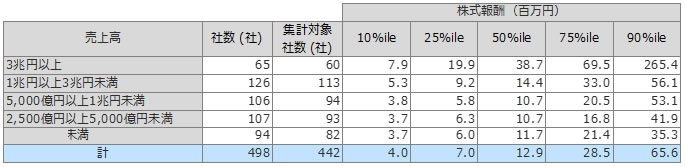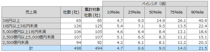 TOPIX500社におけるペイレシオの中央値は9.0倍であった。企業規模が大きくなるにつれてペイレシオが高まる傾向にある。