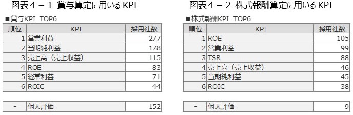 賞与算定に用いるKPIは多い順に①営業利益、②当期純利益、③売上高(売上収益)。株式報酬(業績連動型)は①ROE、②営業利益、③TSRとなっている。下表は延べ採用社数であるが、KPIを複合的に組み合わせて用いる企業も少なくなかった。