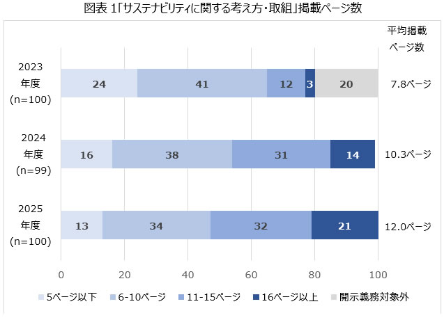 今後、本稿を含む全4回の連載によって2025年度のサステナビリティ編の調査結果を報告する。本稿(サステナビリティ編 第1回)では、「サステナビリティに関する考え方・取組」掲載ページ数、マテリアリティ/ダブルマテリアリティの開示状況、記載されたサステナビリティ関連の主要キーワードの3つの観点から調査結果を報告する。第2回ではガバナンスと戦略、第3回ではリスク管理、指標及び目標、第4回ではSSBJに関する動向について取り上げる予定である。
