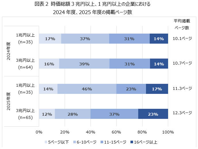 SSBJ基準は時価総額3兆円以上、時価総額1兆円以上東証プライム市場上場企業を対象に、それぞれ2027年3月期、2028年3月期に適用することが見込まれている。本調査では、各社の事業年度終了日の時価総額に応じて3兆円以上、1兆円以上の企業に分類し、2024年度と2025年度の掲載ページ数を整理した(図表2)。(※4)