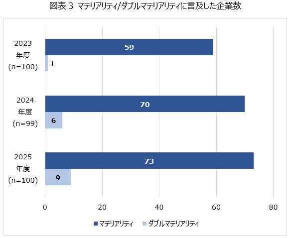 マテリアリティ/ダブルマテリアリティの開示状況を図表3に示す。2025年度に有価証券報告書においてマテリアリティに言及した企業は100社中73社と、2024年度の70社より微増した。特定したマテリアリティの内容、特定プロセスに言及するのみではなく、開示内容の構成として、特定したマテリアリティごとにガバナンス、戦略、リスク管理、指標及び目標を開示する企業も確認できた。